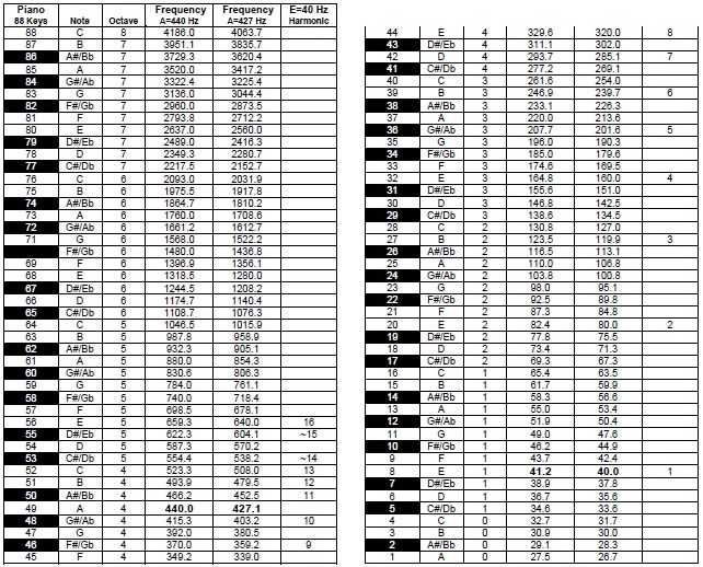 Using the equal temperament tuning system, which is the standard found on all modern pianos, A427 (versus A440) is where A would be if a low E were set to 40 Hz (see below). Tuning A to 427 Hz is not a major deviation from the norm. In fact, the tuning fork was invented in the early 1700s by Joseph Sauveur and he was the first to propose a standardized pitch, recommending a tuning convention of A at 427 Hz. Even 100 years later in 1811, the Paris Opera House was known to use an A427 for their orchestral tuning. Tuning A at 427Hz is based on a middle C at 256Hz, which has mathematical implications. That is, two to the eighth power is 256.