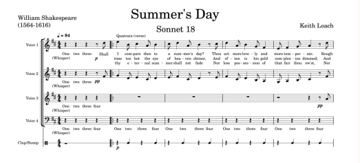 These a cappella arrangements of Shakespeare sonnets attempt to stay true to the style of music in use and popular at the time. Shakespeare wrote 154 sonnets, all of which were written in iambic pentameter and contain fourteen lines of text comprised of three quatrains (verses/descriptives) and one couplet (conclusion/resolution). The quatrains here play on the iambic pentameter rhythm in a 3-beat pattern over a 4/4 time signature.